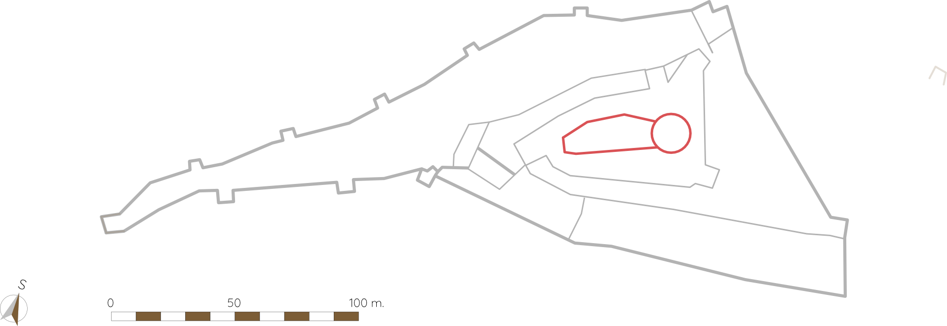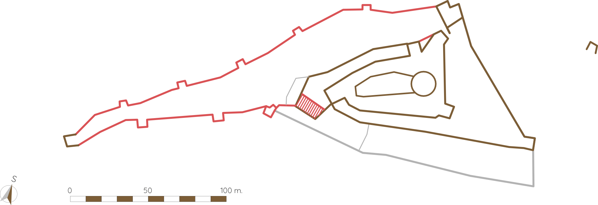 Útočník kombinoval nápor ze dvou stran, a to z původního směru od východu, kde postupoval po částečně přístupném horském hřbetu a zasypal částečně přední příkopy a ne celkově dobudovaný systém příkopů po obou stranách cesty až k valu před první hradní branou, kterého dobyl a částečně odstranil pro možnost přisunutí obléhacích strojů až k bráně; a posléze od západu, po relativně mírných úbočích dolního hradu s využitím jeho teras.